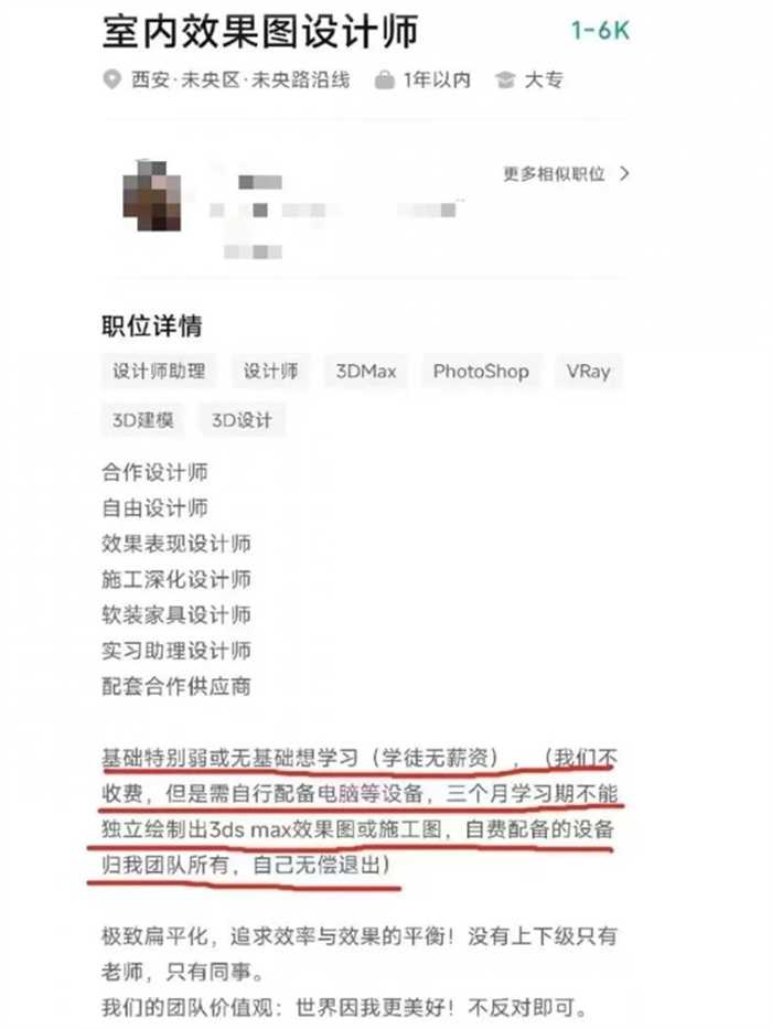 根据网友爆料的图片显示,这个室内效果图设计师的岗位薪资待遇是1~6k,在职位详情中明确标注,需要自行配备电脑等设备,有三个月的学习期,如果达不到实习要求自费配备的设备也归公司所有,让员工自己无偿退出。评论区里也遭到了很多网友的吐槽,真是大千世界无奇不有,公司这样的行为简直是强盗。