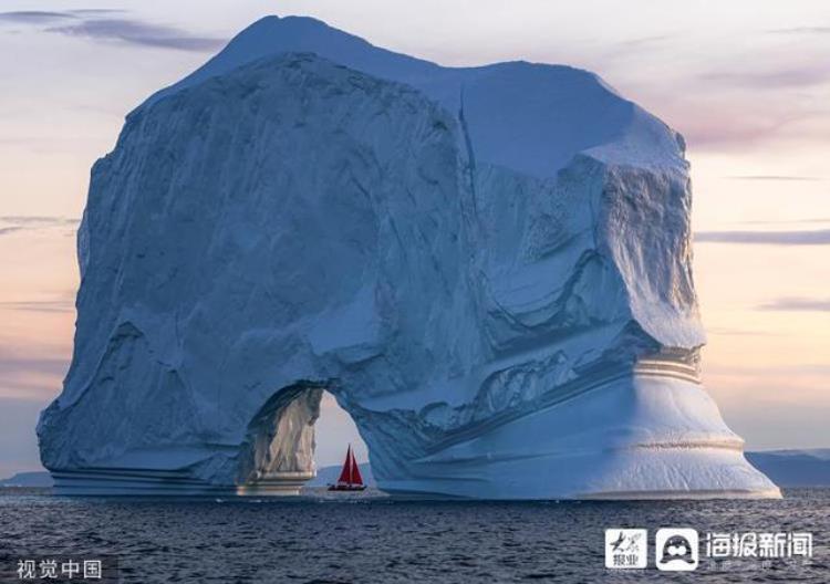 2020年3月23日,格陵兰迪斯科湾,一艘红色的帆船在巨大冰块前显得十分渺小。