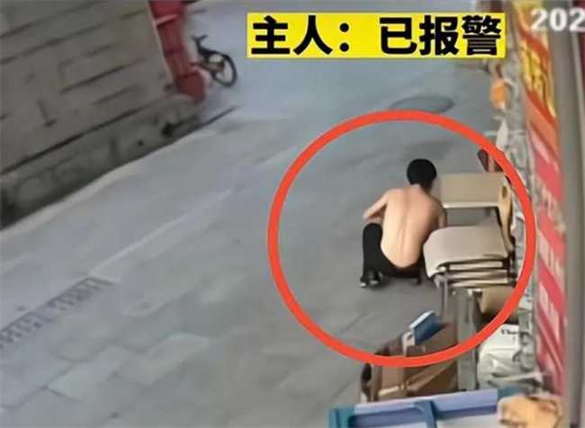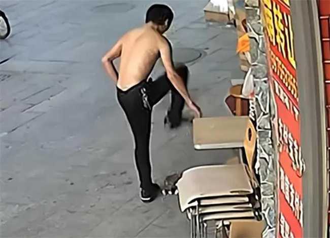 事发当天,一名光着膀子的年轻男子骑着自行车停在一家小店铺门口。他没有任何购物或偷盗的意图,却将注意力转向了躲在桌子底下的小猫。他将小猫拽了出来,然后用力踩在了它的头部。