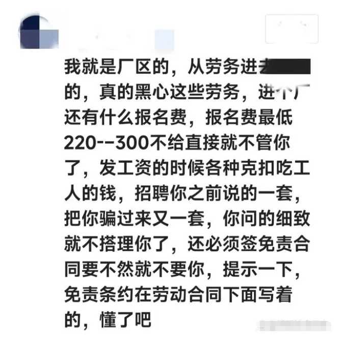 网友风姿绰约:强烈建议取消这些黑中介,他们就是靠欺骗打工者生存的,底层老百姓的日子本来就很艰难,再经历黑中介和所谓的用工方的各种克扣,还让不让打工者活了?