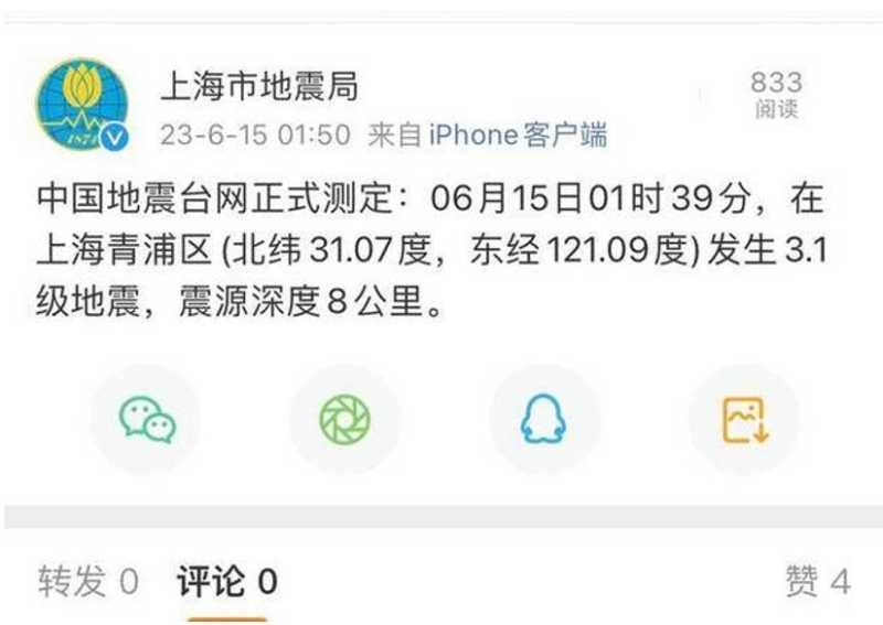 上海青浦区发生3.1级地震 暂无伤亡损失