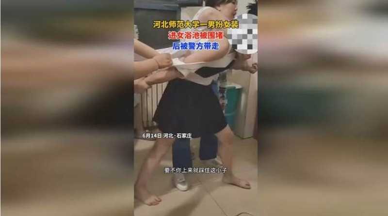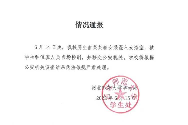 河北师范大学官方微博的通报,能够看到这起事件在6月14日晚间发生当晚,一名叫俞某某的男生穿着女装进入到女生浴室当中,准备偷拍,男性还是特意打扮过的,企图能够从中蒙混过关,这些行为被其他的学生以及值班人员当场就发现了,并且迅速将这名男生控制移交给了公安机关,被警察带走的时候,浴室门口有众多学生围着,学校表示对于公安机关最终调查的结果会严肃的处理。