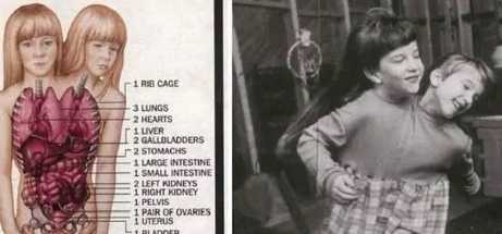 在她们的上半身,拥有两个心脏、四个肺、两个胃,以及三个肾,而她们的肝、膀胱、大肠小肠,以及子宫等,则都只有一套。