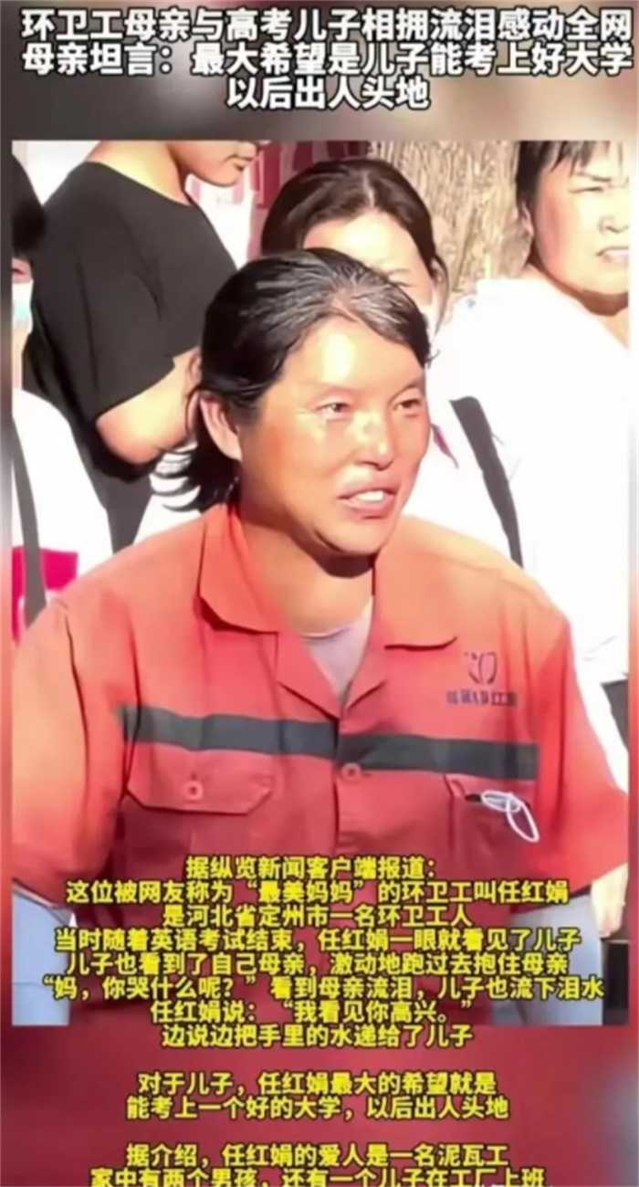 环卫工妈妈通过这个视频火了之后,官方也随即对她进行了更深入的报道。这位妈妈叫任红娟,家境的确贫寒,她的丈夫在工地上打零工,大儿子大学毕业后在本地工作。参加高考的二儿子平日学习也不错,一家人虽然日子过得难一点,但家庭氛围非常温馨。