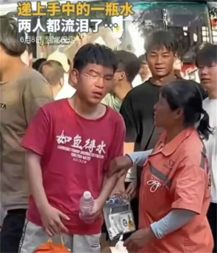 孩子走出了考场,环卫工妈妈激动地走向孩子,将手里的那瓶水递给了孩子,然后流下了眼泪。孩子和妈妈轻轻地拥抱了一下,并没有因为母亲是环卫工而感到“丢人”,相反,看到妈妈流泪了,孩子也流泪了。