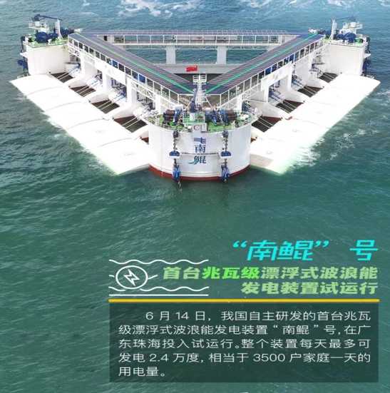 6月14日,我国自主研发的首台兆瓦级漂浮式波浪能发电装置“南鲲”号,在广东珠海投入试运行。整个装置每天最多可发电2.4万吨,相当于3500户家庭,一天的用电量。