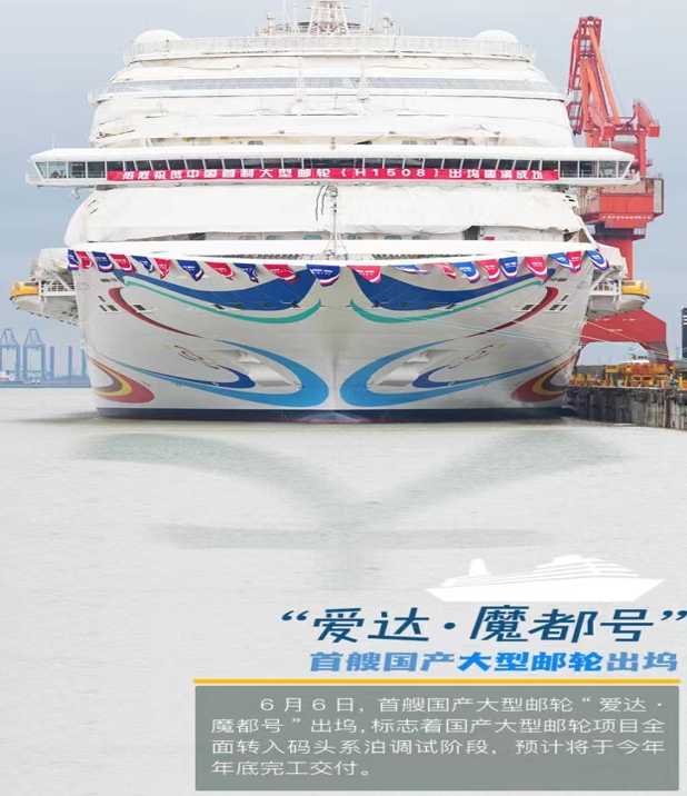 6月6日,首艘国产大型游轮“爱达 魔都好”出坞,标志着国产大型游轮项目全面转入码头系泊调试阶段,预计将于今年年底完工交付。
