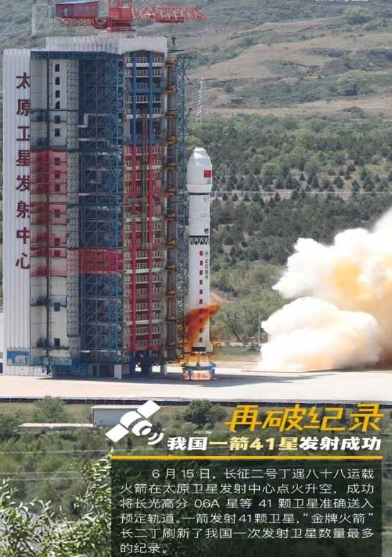 6月15日,长征二号丁遥八十八运载火箭在太原卫星发射中心点升空,成功长光高分06A星等41颗卫星准确送入预定轨道,一键发射41颗卫星,“金牌火箭”长二丁刷新了我国第1次发射卫星数量最多的记录。