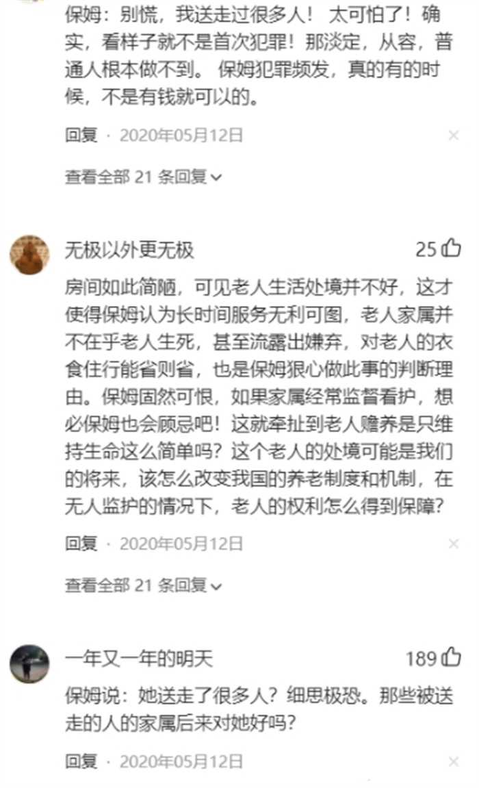 当时保姆说她已经把好些年龄大的老人送上路了。