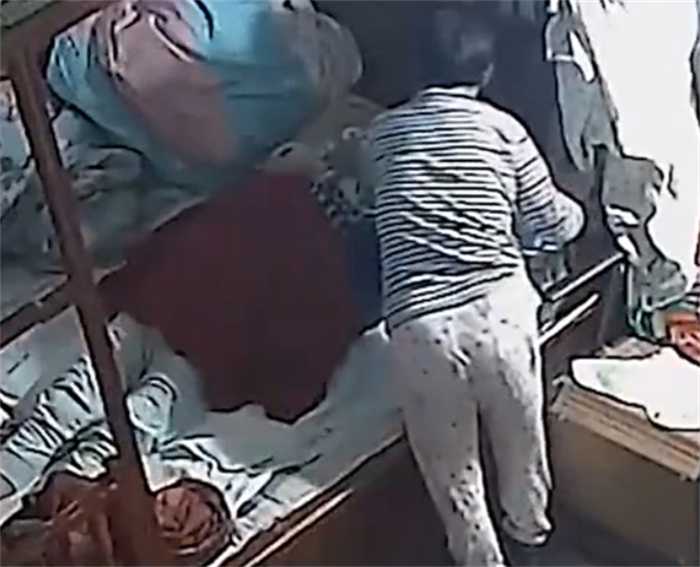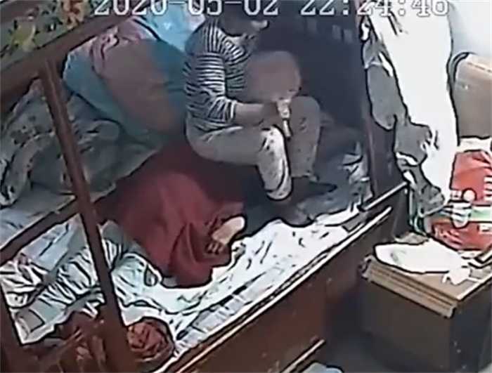 回来后又继续用毛巾捂着老人的脸,之后竟然又直接上床坐到了老人的胸口上,继续按压着。