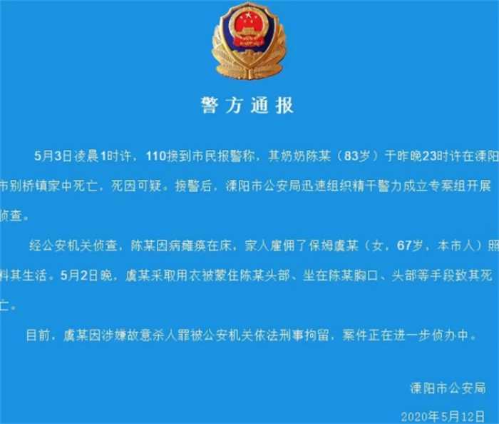 5月12日下午,溧阳市公安局发布警方通报,确认了老人就是被保姆监控中的那一番行为害死的。