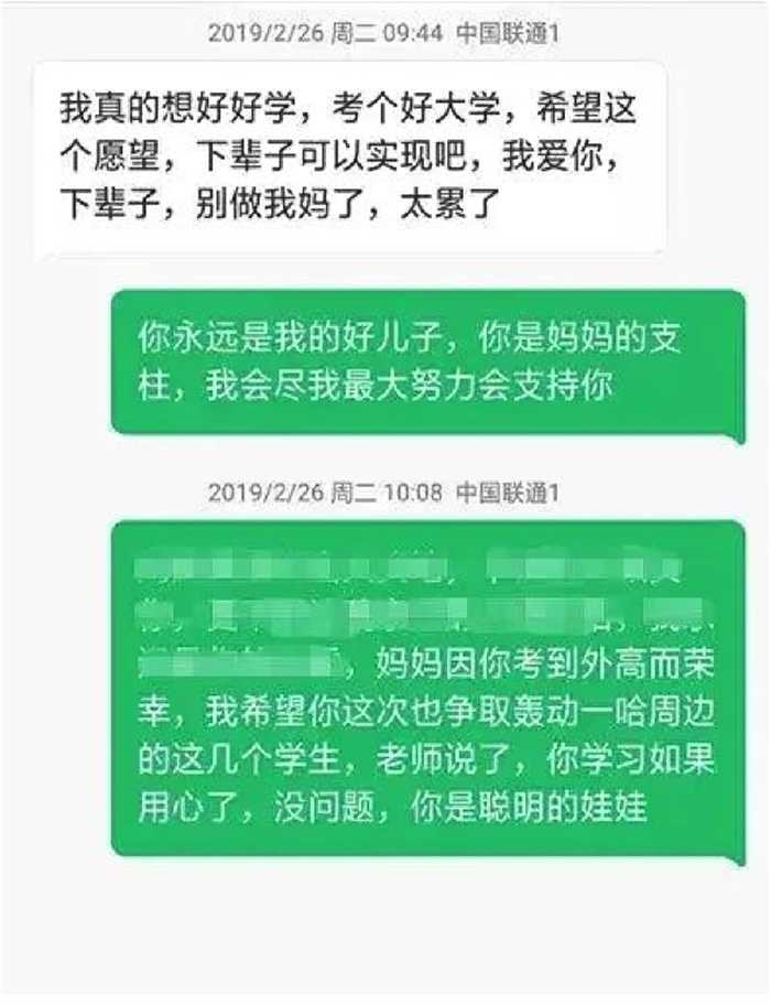 他告诉母亲,希望下辈子可以实现他考个好大学的愿望,并且还希望她下辈子不要再当他的妈妈了,那太累了。