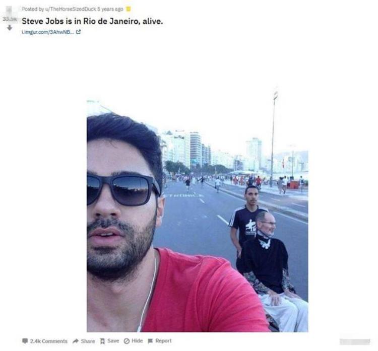 2014年,Reddit上也曾流传过一张酷似乔布斯的男子照片。自拍者身后是坐着轮椅的“乔布斯”,照片拍摄地点是巴西里约热内卢,后来证实是一名患有肌萎缩侧索硬化症的病人。