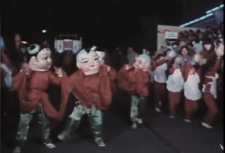 黑夜里舞龙的队伍,加上大头娃娃报喜的画面,再配上庄严肃穆的古老编钟,画面与背景音交织在一起,新年的氛围感一下子被恐怖气氛拉满,也成了1986年春晚上的败笔。