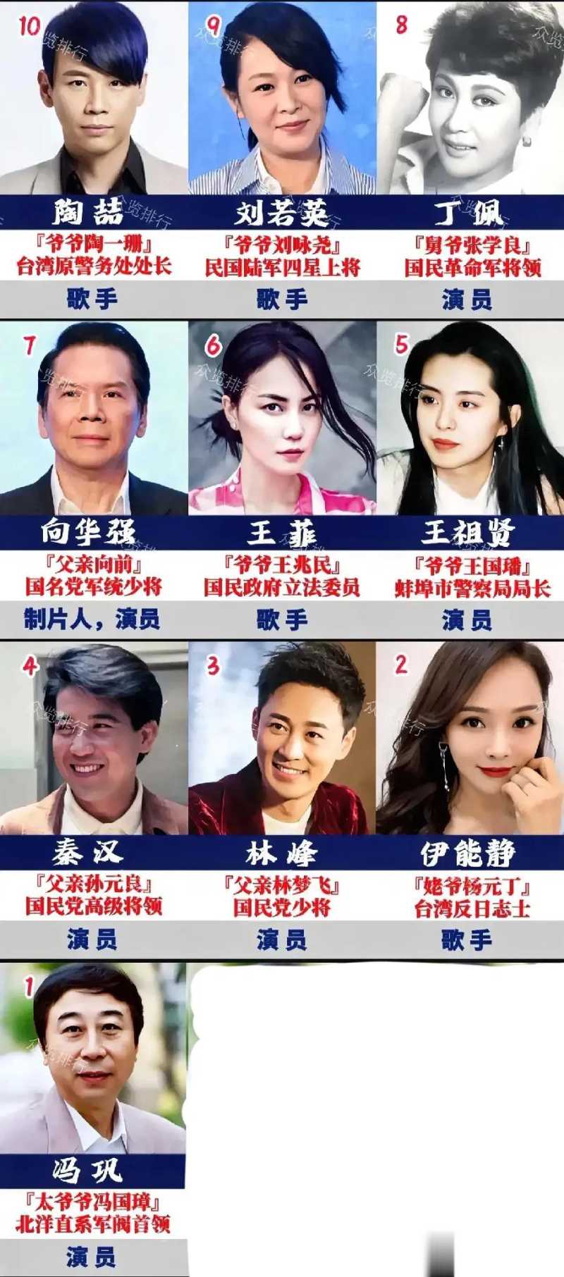 真有“后台”的十位明星。如图所示,最厉害的一位是其太爷爷是民国大总统,其次就是舅