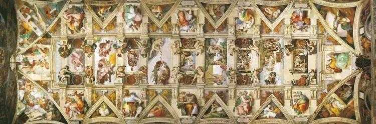 九个主场面和众多附属的人物形象分布在清晰的布局中,每个人物姿势都经过精心的研究,一个比一个精彩。米开朗基罗完全能够描绘任何姿势任何角度的人体形象。