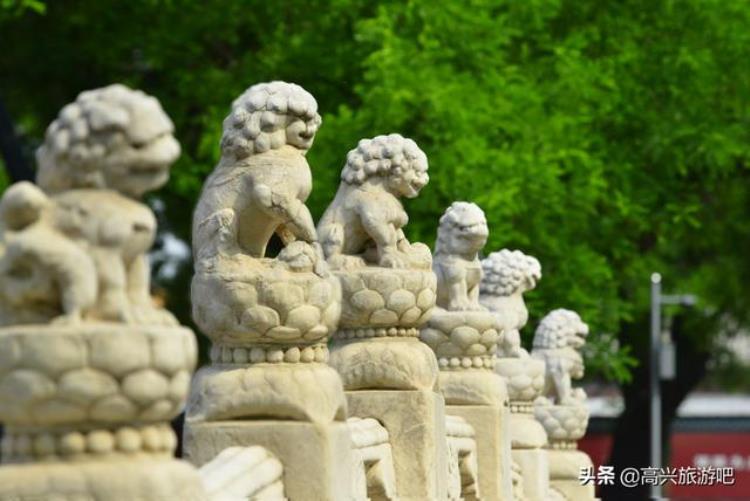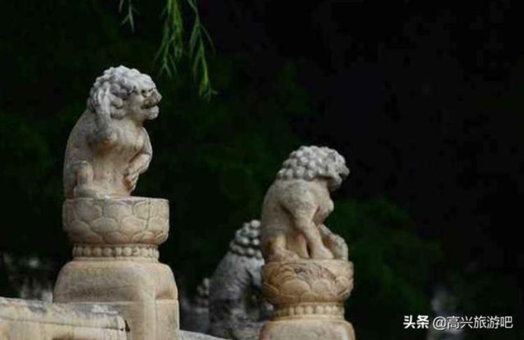 再说断虹桥上的石狮子:20根望柱之上共有34只,形态各异,有蹲着的、有坐着的,唯独其中一个狮子与众不同——站在桥头南边向北数,会看到东侧的第四只狮子两只后腿着地,右前爪捂着后脑勺儿,左前爪护着自己的裆腹部,显得尤其的另类、特别的呆萌!