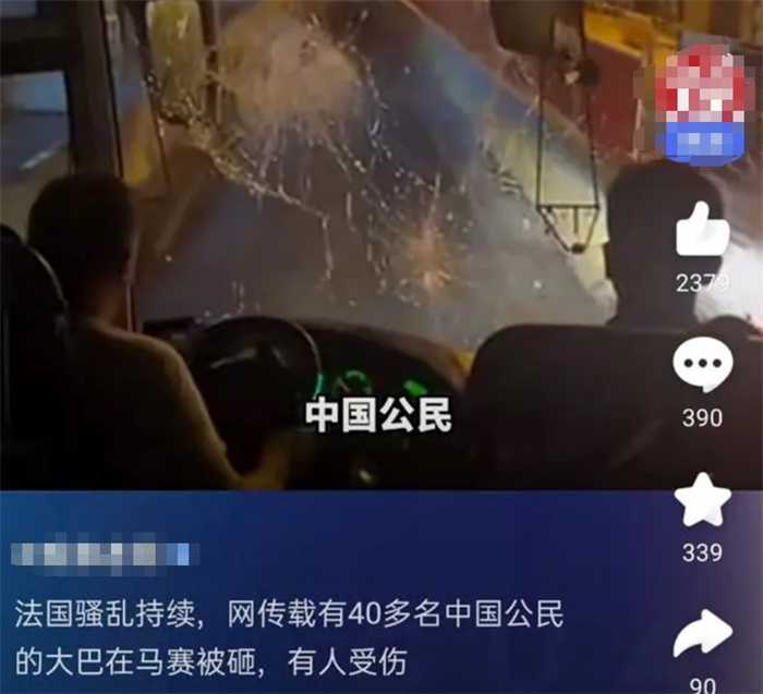 近日,法国警察射杀17岁少年的事情让法国社会连日以来陷入到骚乱状态,根据网友爆料,一辆搭载有41名中国公民的大巴在法国马赛地区遭到十几名黑衣人袭击,车上的很多人被砸伤,黑衣人还试图上车将车上的乘客拉下去,这起事件在网上曝光后迅速引起了国内网友对在法国境内同胞的担忧。