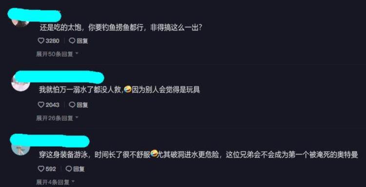 另外,还有网友半是担忧半是调侃地表示“穿这身装备游泳,时间长了很不舒服,尤其破洞进水更危险,这位兄弟会不会成为第一个被淹死的奥特曼”——毕竟就算溺水可能也无人来救,因为可能会错当成玩具。