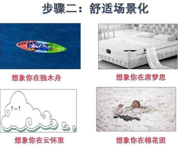 关于想象这个动作,作者直接告诉了我们两个怎么做的的方法,他说:想象你身处在大海里的一帆独木舟里轻轻摇曳,以及温暖的席梦思里邂逅时光......但他并没有告诉我们这其中原理~