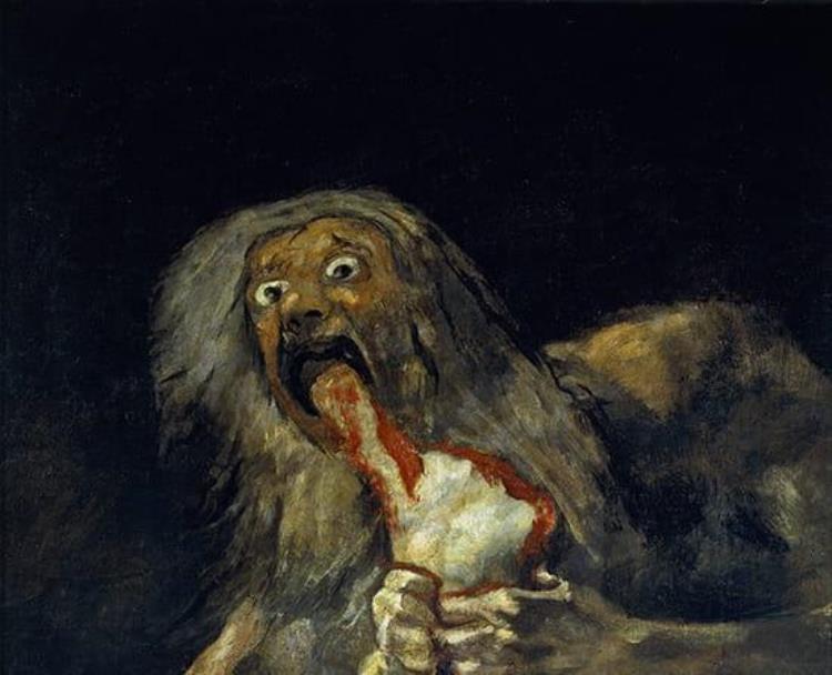 这幅来自西班牙著名画家弗朗西斯科·戈雅笔下的画,是戈雅晚年所绘制的《黑色绘画》系列中最为著名的一幅,以阴暗恐怖而闻名。画中是罗马神话中的农神萨图尔努斯为了防止儿子们夺权斗争而将他们全部吃掉。