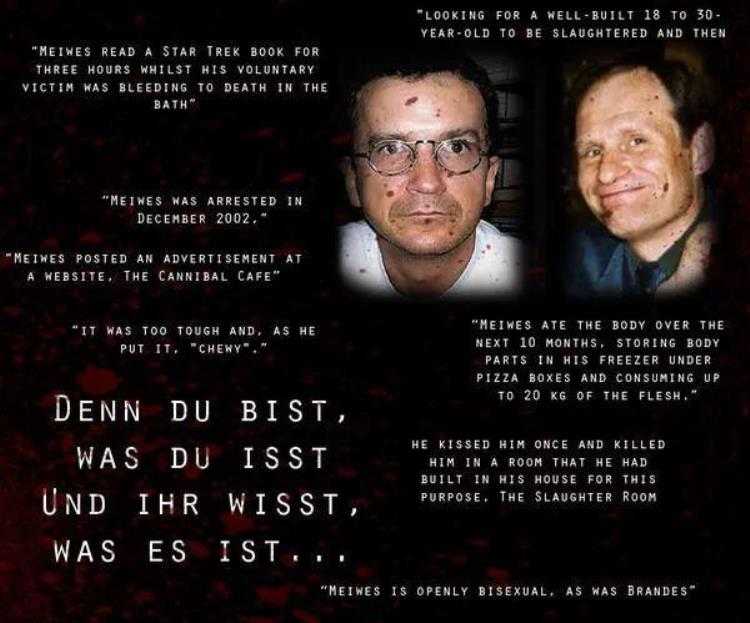 2001年德国人阿明·迈韦斯,在网站上发布了一则广告,广告的大致内容是:寻找一个自愿被人吃掉的人,要求此人体格健壮,年龄要在18岁到30岁之间。如果这是在我国直接回他个“神经病”。问题是,在这则广告发布之后,居然有280多个人联系阿明,并且表示对此事很感兴趣,这群人和阿明聊了很久还聊得很投机。