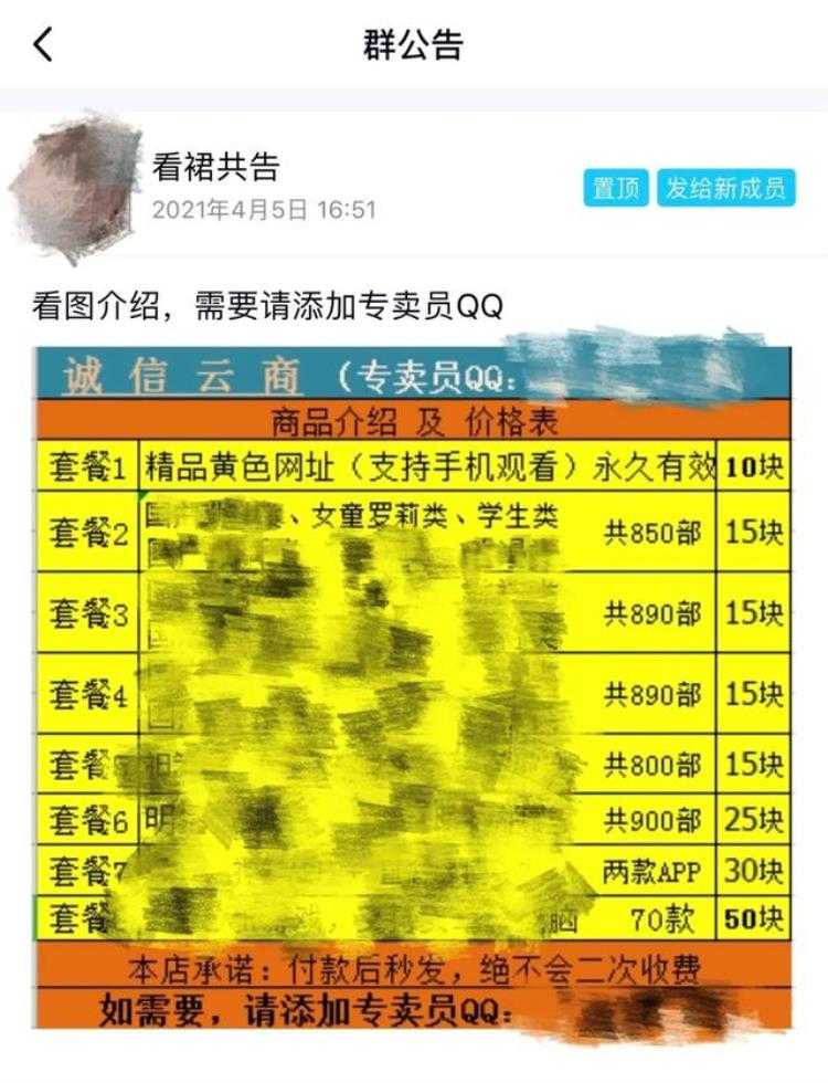 有偿“文爱”“磕炮”“连麦”的产业也随之兴起。在QQ上,有人瞄准青少年的好奇心,自诩“萝莉”,并以衣着不雅的未成年人或“软色情”动漫作为头像和动态相册,吸引青少年“入坑”。这类QQ群中还不时有人出售色情视频的链接,15至20元就能下载色情内容,其中与幼女相关的内容令人发指。