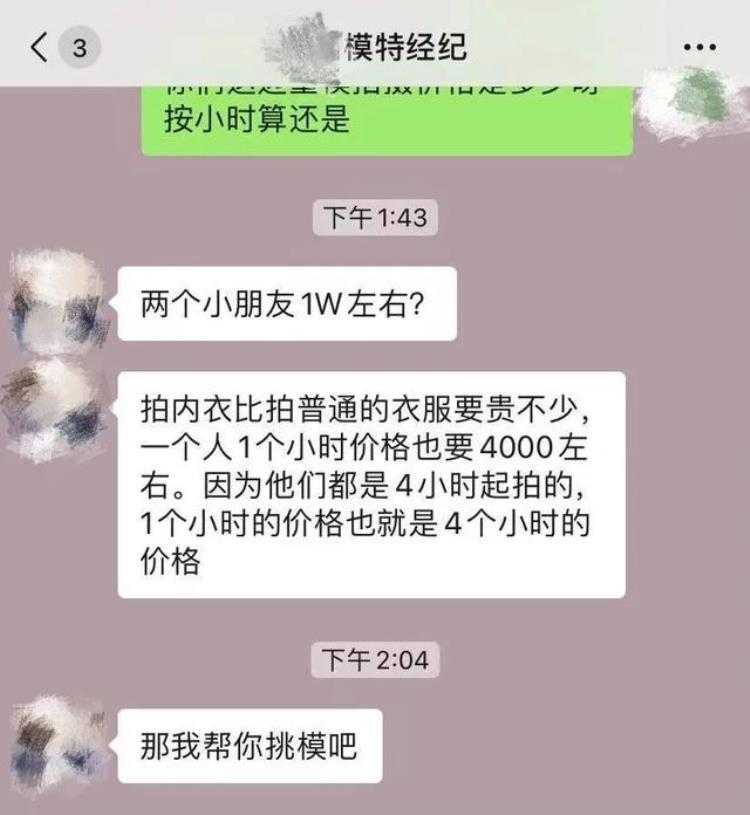 半月谈记者以商家身份联系一位模特经纪人,表示希望找童模拍摄这类广告。对方称,确实有家长对此类拍摄并不在意。这位经纪人表示,儿童内衣拍摄比普通服饰拍摄费用高,每小时4000元,4小时起拍,也就是说,只要花1.6万元,就可以找到童模拍摄这样的“软色情”照片。