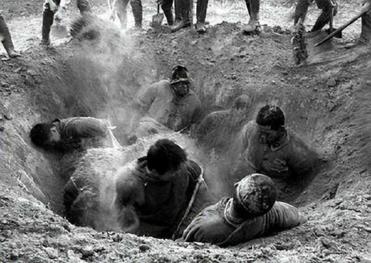 活埋,是战争时常用的手段,一般用于大规模屠杀。战争时的活埋,都是叫战俘自己挖坑,有时会先杀死俘虏再把他们推下去,但时间不够的时候,就直接把他们推进去以后盖土。