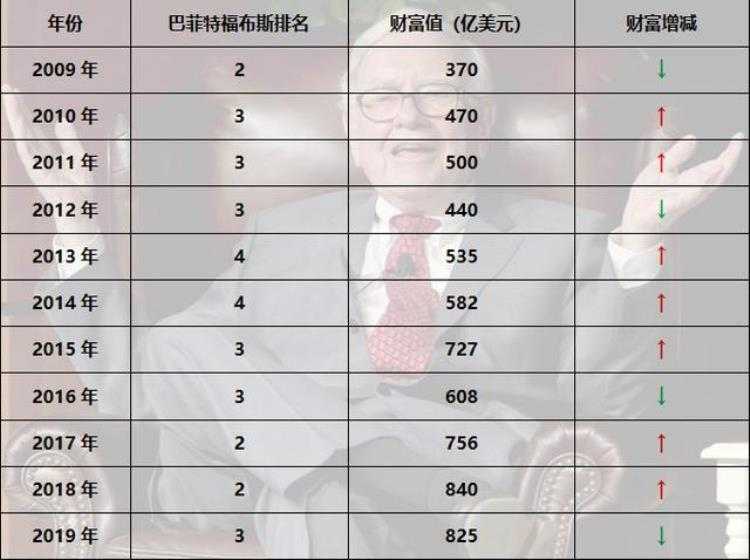 在2008年之后,虽然巴菲特没再登顶,但是依然是福布斯全球富豪排行榜的常客,且长期排行在前二至四位,换言之,2009年直至2019年的福布斯全球富豪排行榜,尽管巴菲特没再成为首富,却仍然排行在2-4位,而且在2009-2019年期间,巴菲特的财富在7个年度对比上一年度均有所增长,最高值是2018年的840亿美元,毫无疑问,这是价值投资给予巴菲特的巨额财富与个人荣耀。