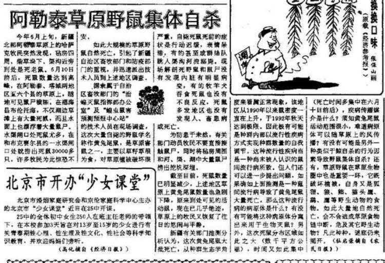 1993年8月8日《文汇报》第6版,曾刊发题为《新疆阿勒泰草原野鼠集体自毙 谁来揭开谜底?》一文,称“今年6月上旬,新疆北部阿勒泰草原上的哈萨克牧民突然发现毡房四周、柴草垛下、渠沟近旁,到处是死老鼠。6月10日前后,死鼠数量达到高峰,在阿勒泰、塔城两地区五、六个县的草原上,随处可见鼠尸横陈。在福海县布伦托海,不仅湖边草滩上有大量死鼠,水面上也漂浮着大量鼠尸。在和布克赛尔县一水渠闸口捞出死鼠达30000多只。”