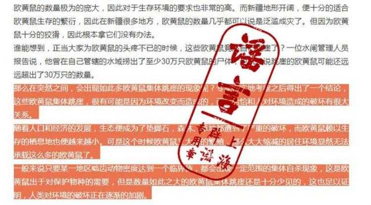 连日来,多个自媒体账号和社交媒体账号都在推送一篇网文,标题大抵为“新疆30万只老鼠集体跳崖自杀”以及一句“全球关注”“令人深思”“让人后怕”“该重视了”的组合。文章中,将老鼠自杀的原因归咎为人们对环境的破坏,称“随着人口和经济的发展,生态便成为了垫脚石,森林、草地都遭到了严重的破坏,而欧黄鼠赖以生存的栖息地也便越来越小”,因而,“保护环境已经是迫在眉睫的事情了”。