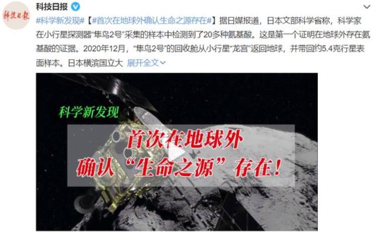 据日本媒体报道,日本文部科学省称,科学家在小行星探测器“隼鸟2号”采集的样本中检测到了20多种氨基酸。这是第一个证明在地球外存在氨基酸的证据。