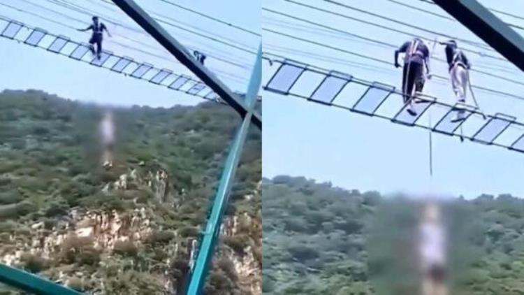 就在同一天,国内两处景区的“步步惊心”都发生了游客坠落事件。其中一处景区视频中,孩子掉下悬空桥时,身上的保护措施已经脱离,尽管有人试图营救,但他还是从高处坠落。而另一处事故中,游客坠落后,就在救援人员正要将该游客拉上桥时,游客从安全绳上脱落再次下坠。