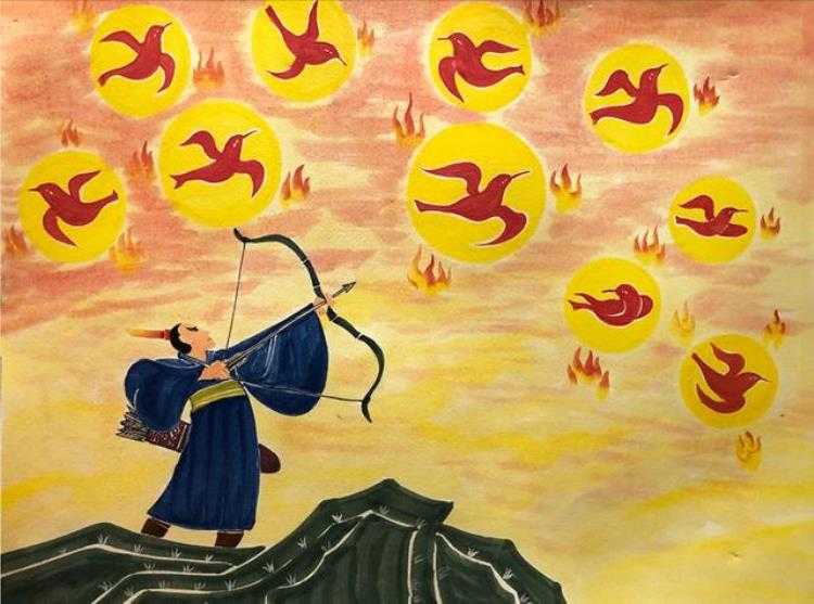 古代的时候,天上有十个太阳,把庄稼都晒死了,人们都活不下去了,有个叫后羿的人,力大无穷,他怜悯那些可怜的子民,拉着弓弦,一口气射九轮以上的太阳,命令仅剩的太阳按时起落,为子民谋福利。嫦娥是后羿的妻子。除了他教技艺和打猎,整日陪着他的妻子。许多有志之士都慕名而来,想要拜师学艺,蓬蒙也在其中。