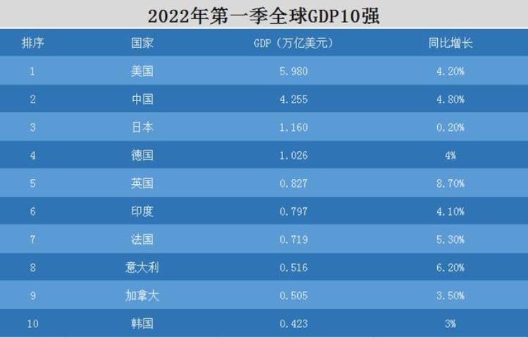 先来看一下2022年第一季度全球GDP10强国家的表现。
