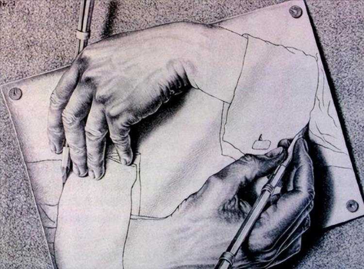 有一幅著名画作叫《手画手》。在这一幅画中,左手和右手分别画着彼此的手腕,两只手连同手腕仿佛是构成了一个莫比乌斯环的形状,不知道到底是左手在画右手,还是右手在画左手,作者为我们留下了无限的遐想。它仿佛像是在象征着现实,到底谁是起点?谁是终点?我们真的能够分清楚吗?你真的能够确定我们所理解的现实就是现实,而梦境就是梦境吗?