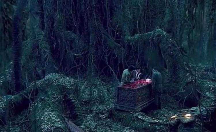 玉棺中的大祭司是用一种红色的液体浸泡着,保持着尸身不腐。摸金三人组开棺之后尸体还有弹性,更诡异的是尸体上还缠着一条剥了皮的巨蟒。巨蟒上面还有一些红色的肉线,隔一会儿就会跳动几下,仿佛活着一样。实质上这是一条痋蟒,老榕树也被寄生了,上面全部是红色肉线。这些红色肉线可以吸干附近人畜的鲜血,再传导到玉棺之中,维持着尸体不腐。摸金三人组也遭到了红色肉线的攻击,被吊在了空中,等老胡打破玉棺流尽血液后,那些红线瞬间变得干枯萎缩。