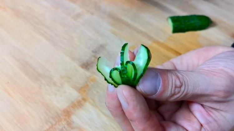 第六步:利用这个时间,我们可以切一个黄瓜造型。造型是花的状态如下图。黄瓜对半切开,然后切五刀。每一刀的刀口尾部要切断。