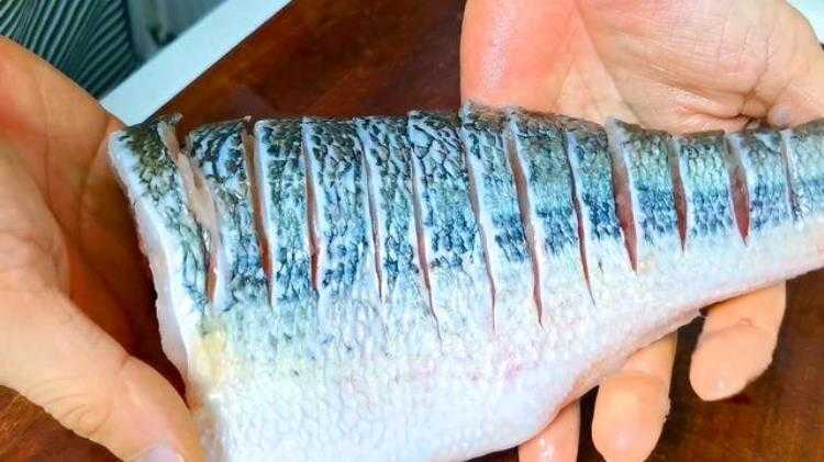 4、切鱼的小技巧,鲈鱼改一字刀的时候,为了卖相好看而且为了让刀口整齐,可以先用刀在鱼的身上切一刀,间隔1cm切浅一点做一个标记,最后用力的把鱼的骨头切断。如果力气不够大,可以用手拍刀背,这样能够加速切断鱼的骨头。