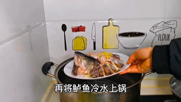 第五步:时间到了以后,将鲈鱼冷水上锅。上汽以后蒸8分钟。