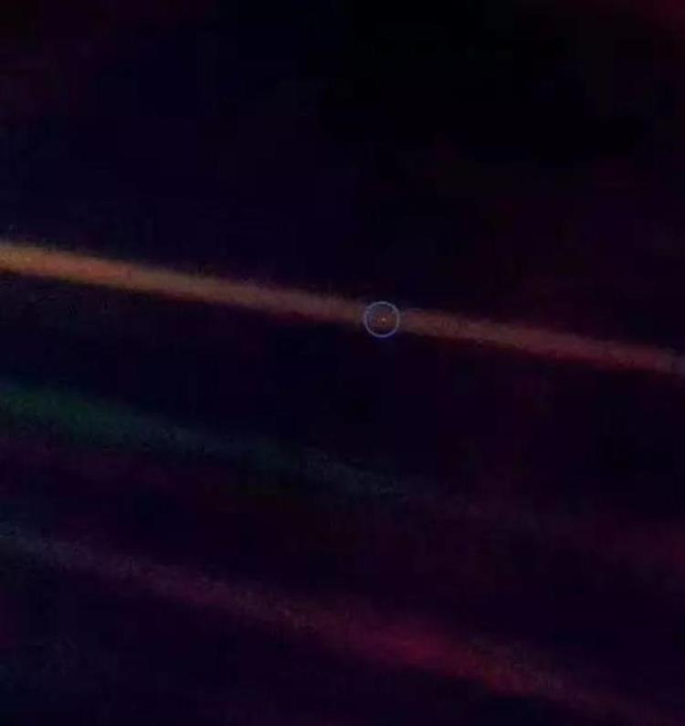 下图是1990年,旅行者1号探测器即将飞出太阳系的时候,在距离地球60亿公里的地方,美国国家航空航天局命令它回头再看一眼,拍摄了60张照片,其中一张上,正好包括了地球——图中那个亮点。