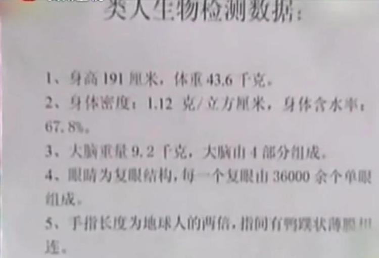 令记者奇怪的是,检测报告说得如此详细,但这个外星人却没有半点被解剖的痕迹。记者问李凯:有没有打算把它捐出去,做科学研究?李凯说:我和它已经有了感情,不想捐出去。最主要的是,我怕它的同伴会再来找我。我把它保存好,等它的同伴来了后,就还回去。