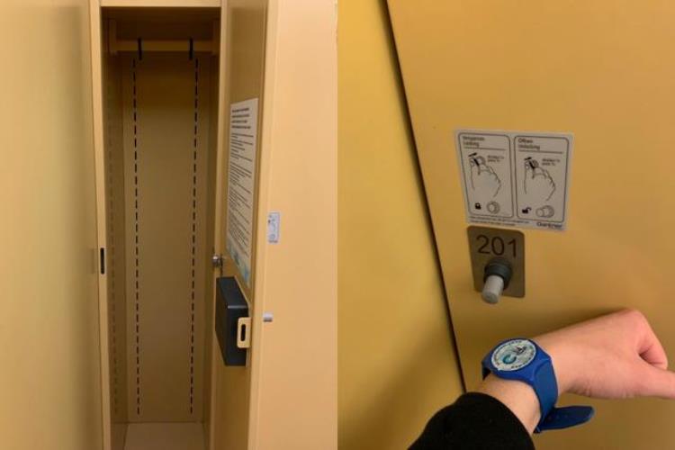 买票的时候售票员会给每个人分发一个蓝色电子手环,并没有标注固定的储物柜子编号,游客可以随意选择空的储物空间并根据柜门上的提示操作即可。