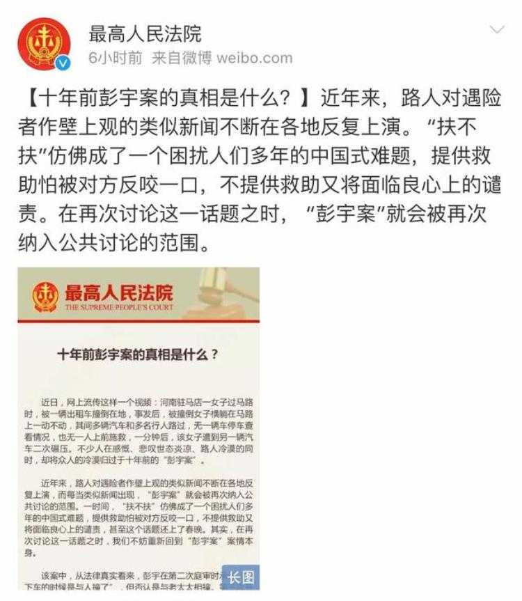 今天上午,@最高人民法院 发了一条长微博,题为【十年前彭宇案的真相是什么?】