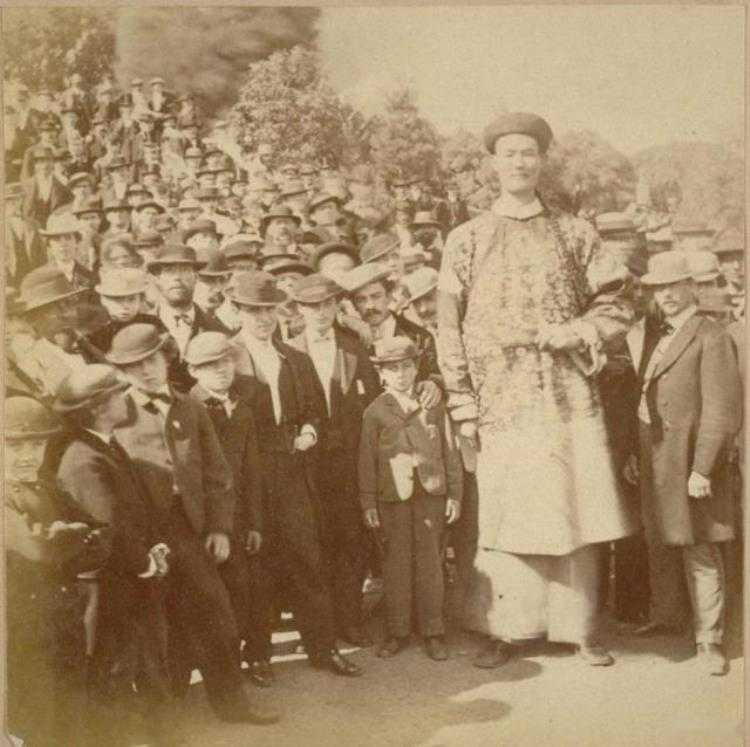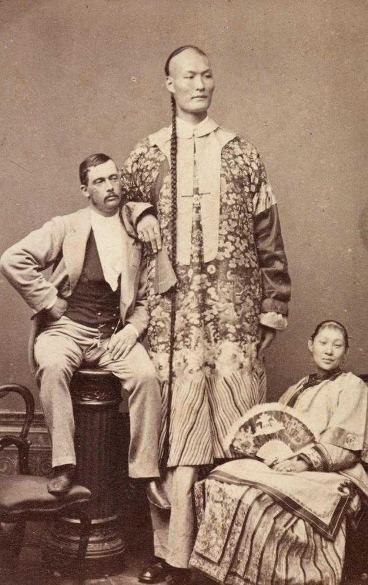 他是19世纪清朝人,生于道光年间,他的身高是2.41米,1880年左右在香港所拍的照片上看到