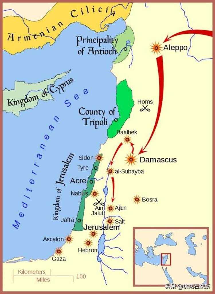 图中红色区域是十字军国家安条克公国,上方紫色区域是奇里乞亚亚美尼亚王国