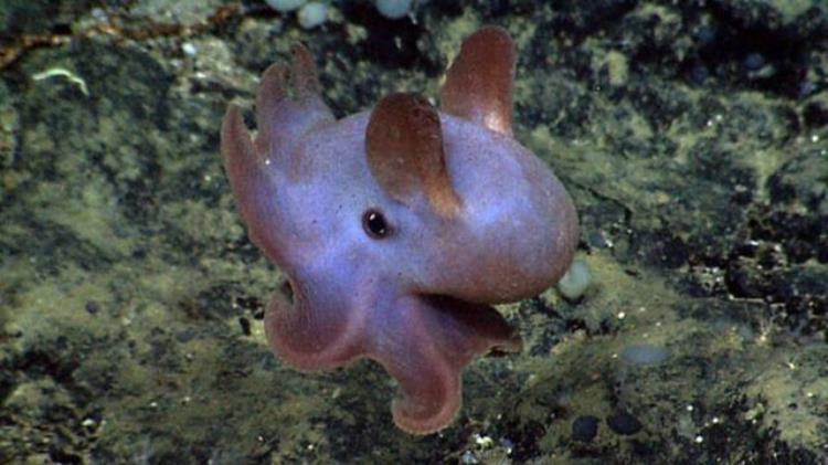 9. 小飞象章鱼烟灰蛸属包括至少15种世界上生活在最深海的章鱼,它们被发现在水面以下 3962.4米以上。在如此极端的深度里,它们习惯了极其寒冷的温度和漆黑的黑暗。它们平均只有 20.3-30.5厘米长,因为苍白的钟形身体上突出的两个巨大的鳍,就像巨大的大象耳朵,因此它们被称为“小飞象章鱼”。虽然有些人认为这些动物很可爱,但不可否认的是,它们的长相也很奇怪。据美国《国家地理》报道,它们的吸盘上有细长的突起部位,被称为“卷毛”,科学家认为这些身体部位是用来进食的,然而仍不确定它们的用途是什么。