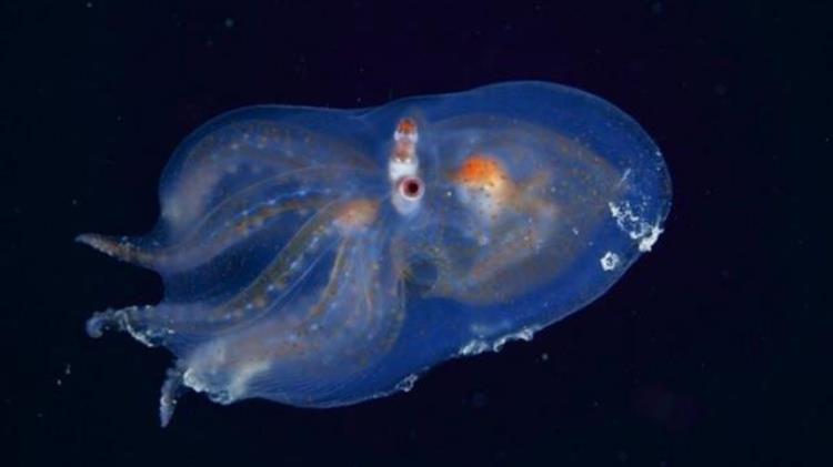 2. 望远镜章鱼想要观察到望远镜章鱼,你必须在印度洋或太平洋表面以下至少1981米的地方旅行。这种鱼是透明的,几乎无色,有8只相同大小的手臂,手臂之间有一层纤细的织带。望远镜章鱼有几个特点,使它不同于其它章鱼。首先,它不在海底附近水平游动,而是垂直悬浮,在水中漂流。科学家们认为,这可能会使捕食者更难从下方发现这种生物。此外,该物种有两个管状的旋转眼球,这使它的周边视野开阔,使它能够发现更多的捕食者和猎物,这或许就是它的名字由来。研究人员完全无法解释这些奇怪的窥视者背后的进化机制。一些科学家认为,这一物种和其它一些物种已经进化到整个生命都在幼虫阶段度过。这种现象被称为“幼态持续”,其特点是在幼体阶段生理发育和性成熟缓慢或延迟。