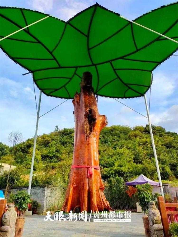 廊棚展览架上其中一株长达11米、重达9吨;另一株长达11.7米、重达11吨,此树生长在黔东南从江县,2017年因山体滑坡导致死亡,通过贵州省林业厅批准后采伐,运往贵阳市珍藏,经检测此树树龄为1300年。